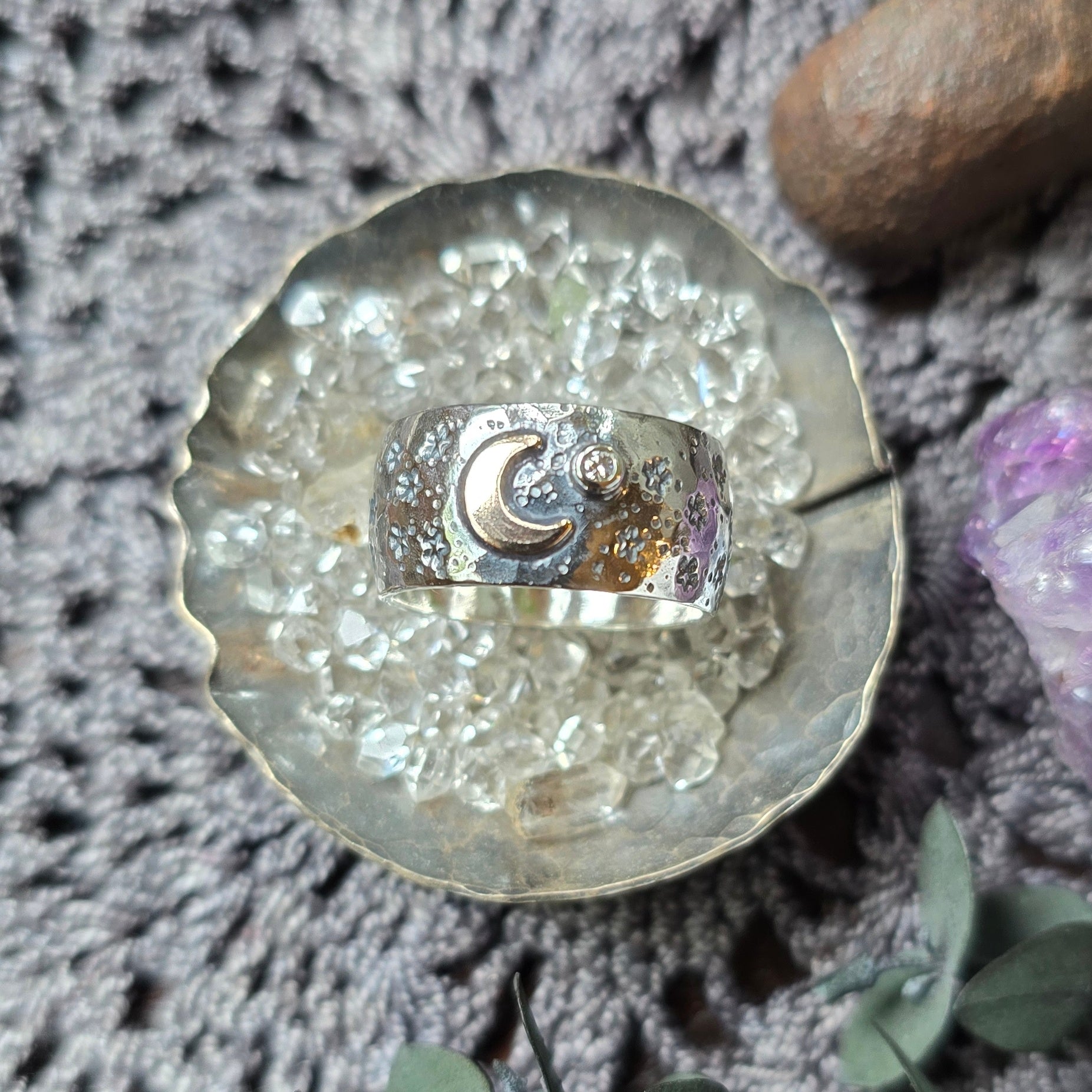 This simple silver textured & hammered band is constructed of 19 gauge (1mm) 925 sterling silver. Detailed with a 14k gold raised crescent moon and stamped with dreamy little stars...finished with an oxidized patina. You're choice of certified lab grown or genuine 2mm diamond. Band is given a domed profile for a true to size comfort fit.
